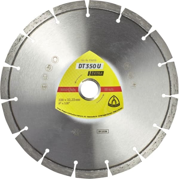 Круг KLINGSPOR DT 350 U EXTRA служит для распила бетона и других строительных материалов. Диаметр оснастки равен 115 мм. Устанавливается на угловые шлифмашины с посадкой 22,23 мм и скоростью вращения до 13300 об/мин. Режущая часть представлена 8 высокопрочными сегментами, прикрепленными к корпусу методом лазерной сварки. Используется как с подачей охлаждающей жидкости, так и без нее.