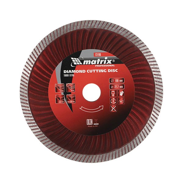 Алмазный диск MATRIX Турбо Extra 180х22,2 мм (сухая резка) обеспечивает точный рез и высокую производительность с помощью турбо-кромки. Подходит для резания железобетона. Посадочное отверстие - 22,2 мм.