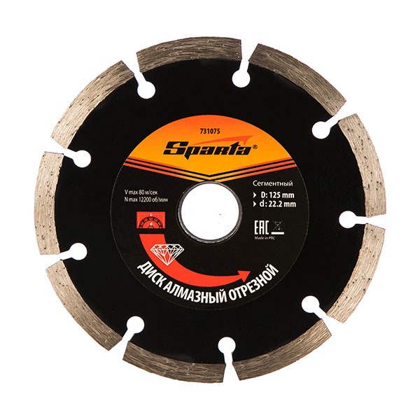 Алмазный диск Sparta 125х22,2 мм (сухой рез) для разрезания без охлаждающей жидкости кирпича, бетона, камня. Универсальное посадочное отверстие 22,2 миллиметра позволяет работать с УШМ, камнерезными станками. Максимальная скорость 12200 оборотов в минуту.