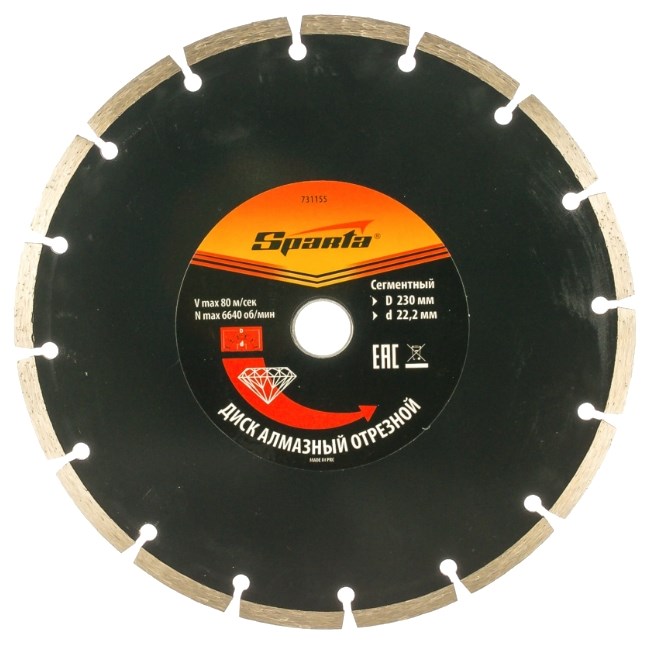 Алмазный отрезной круг Sparta диаметром 230 мм используется для резки бетона, кирпича, камня и иных твердых материалов. Применяется в составе инструмента с посадкой 22,2 мм. Имеет сегментную кромку. Эксплуатируется без подачи воды. Между сегментами предусмотрены прорези, обеспечивающие отвод шлама во время работы.