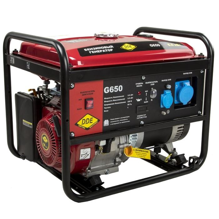 Бензогенератор DDE G650 на 6 кВт применяется в качестве резервного источника электрической энергии. Предназначен для обеспечения питания однофазных потребителей. Оборудован двумя розетками на 220 В. Рекомендуется использовать генератор не более 3-4 часов в сутки (при 75% мощности).