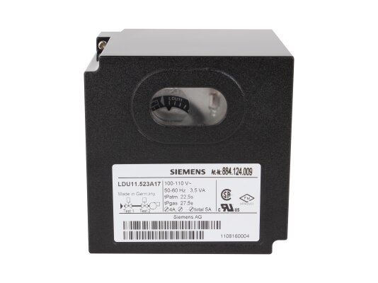 Описание | Блок контроля герметичности Siemens LDU11.523A17 служит для автоматической проверки газового оборудования на наличие утечек для своевременного прерывания подачи газа на горелку и безопасной эксплуатации промышленной установки. Изготовлен по европейским нормам EN 1643. Работает совместно с клапаном отсечки, перекрывающим поток. Принцип работы Блок LDU11 в сочетании с реле давления выполняет проверку герметичности через контроль давления при запуске или перед запуском горелки/ во время предварительной продувки (время предпродувки 60 сек.)/ после управляемого отключения/ при постпродувке. Проверка состоит из двух ступеней: контроль герметичности клапана со стороны магистрали подачи газа и со стороны горелочного устройства. При установлении значительного роста давления на первой фазе или существенного снижения на второй, Siemens LDU11 препятствует запуску горелки, переходит в режим блокировки (срабатывает сигнальная лампа с индикатором неполадок). Особенности и параметры:
