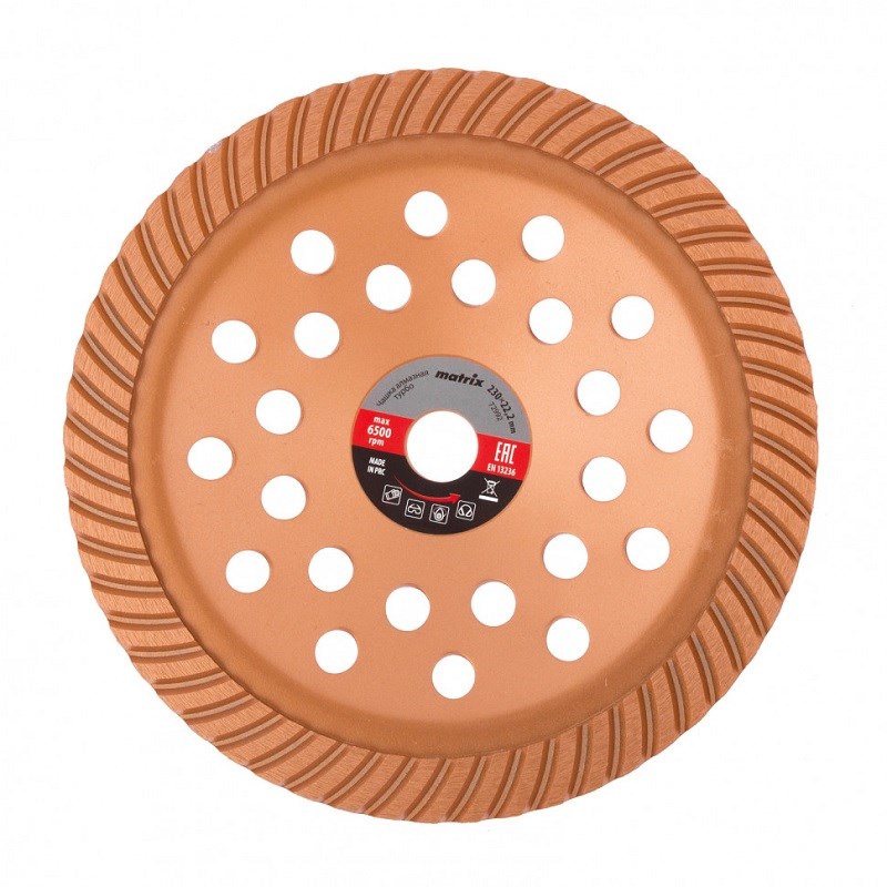 Чашка алмазная MATRIX 230 мм, Turbo устанавливается на вал углошлифовальной машины, для чего предусмотрено посадочное отверстие 22,2 мм. Используется для придания окончательной гладкости бетонным, каменным, мраморным, гранитным и кирпичным поверхностям, а также для снятия фаски на плитах из гранита или мрамора.