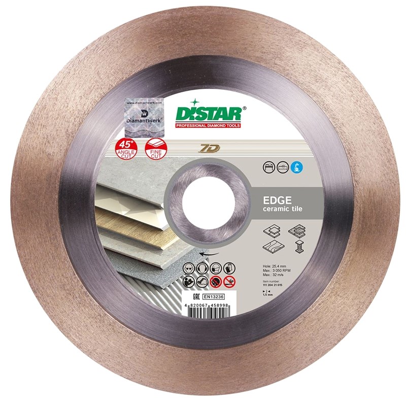 Алмазный диск Distar диаметром 230 мм создан специально для резки керамической плитки, имеющей декоративное покрытие. Также может использоваться для резки керамогранита, мрамора, твердого известняка, а также сапфира. Оснастка имеет тонкую кромку толщиной всего 1,4 мм, которая позволяет производить ровный рез материала. Должна эксплуатироваться с подачей охлаждающей жидкости.