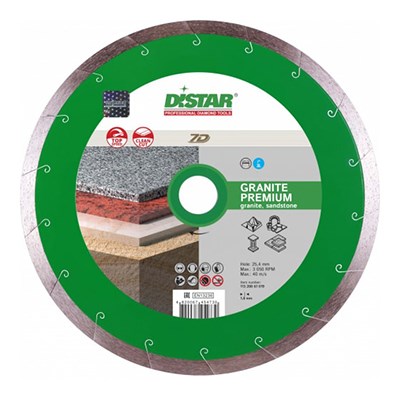 Алмазный диск Distar 1A1R 350x2,4x10x60 Granite Premium с посадочным отверстием 60 мм. Позволяет произвести качественный рез всех типов гранита, керамогранита и мрамора. Диаметр - 350 мм. Рассчитан на интенсивные бытовые и профессиональные нагрузки. Технология лазерной сегментации обеспечивает повышенный рабочий ресурс и производительность. Предусмотрена сплошная кромка толщиной 2,4 мм.