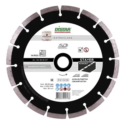230-миллиметровый отрезной круг Distar STAYER предназначен для обработки асфальтобетона и свежего бетона. Используется в составе различного оборудования с посадочным диаметром 22,2 мм. Высокопрочная алмазная кромка отличается большим запасом прочности. Оснастка применяется без подачи воды. Охлаждение осуществляется воздухом, который при эксплуатации попадет в прорези.