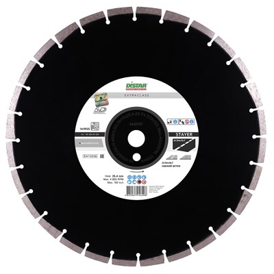 300-миллиметровый алмазный диск Distar STAYER разработан специально для реза асфальтобетона и свежего бетона. Оборудован сегментной кромкой, обеспечивающей быстрый распил материала. Охлаждение отрезного круга осуществляется воздухом, который при эксплуатации проникает в прорези. Оснастка отличается большим запасом прочности.