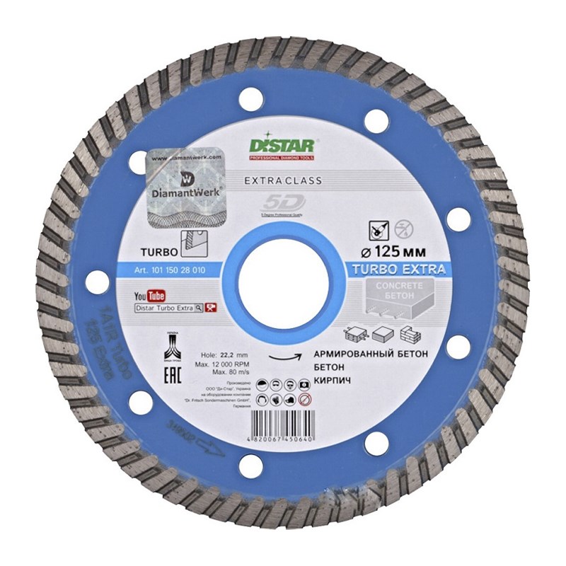 Диск алмазный Distar Turbo Extra Max эксплуатируется для разрезания обычного, высокоармированного, декоративного бетона, кирпичных кладок и плитки. Отлично справляется с бетонными поверхностями любой твердости. Характеризуется высоким запасом прочности и большой высотой режущей кромки. Обеспечивает высокую скорость реза в течении всего срока службы.