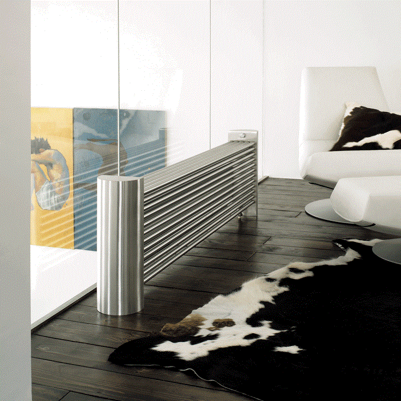 Дизайн-радиатор из нержавеющей стали (полированной или матовой). Способен обогреть целое помещение. Дополнительно может снабжаться LED-подсветкой.