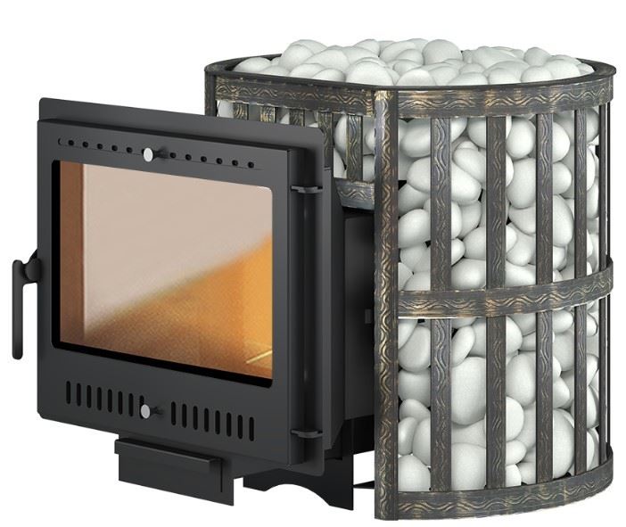 Чугунная банная печь ЭТНА 24 (Панорама) М Ковка предназначена для обогрева парных и создания большого количества горячего пара. Отличается наличием массивной панорамной дверцей с закалённым стеклом, через которое удобно наблюдать и контролировать горение дров. Наружная каменка изготовлена из стальной кованой ленты.
