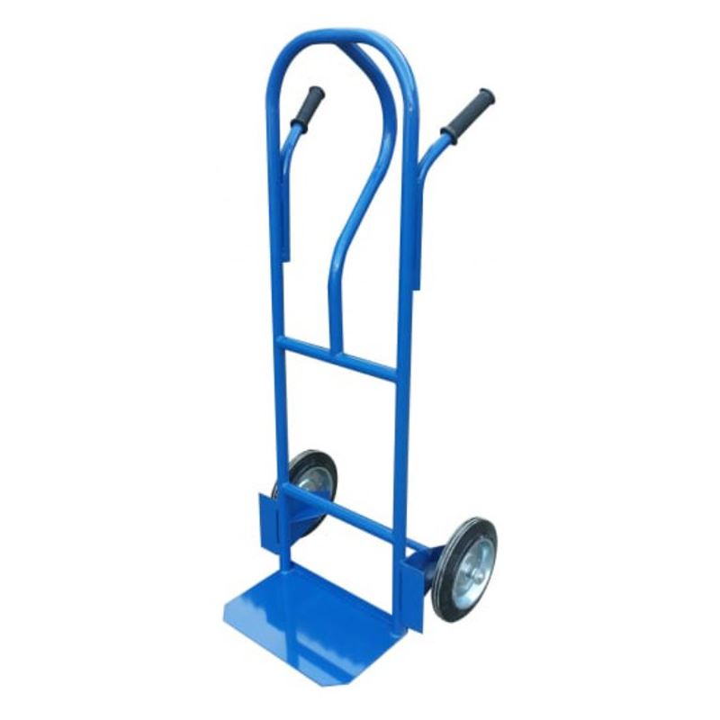 Прочная стальная конструкция Платформа для размещения груза Два литых колеса для движения Рукоять с резиновыми накладками