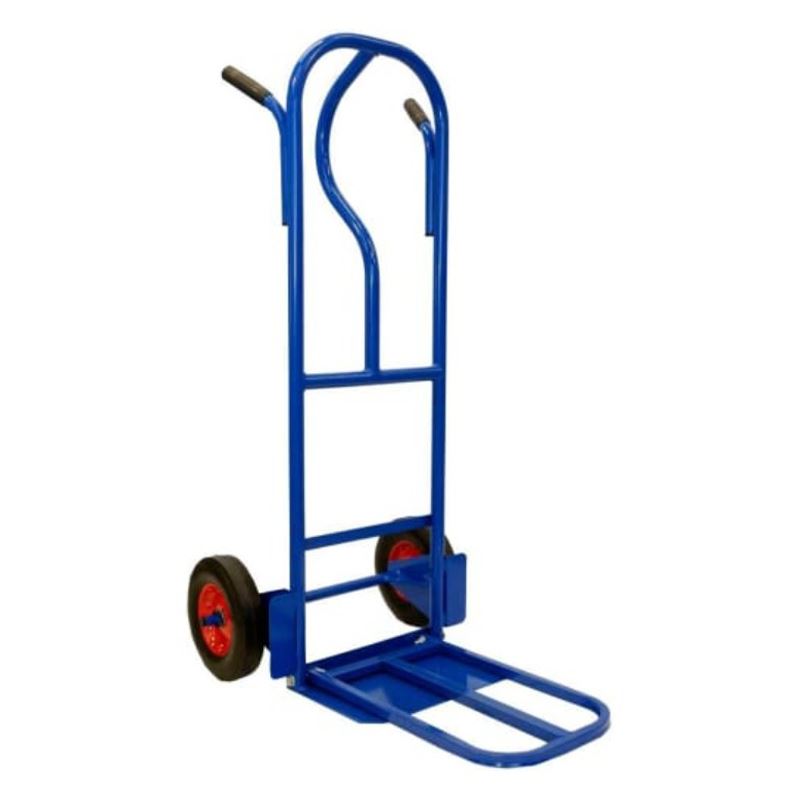 Прочная стальная конструкция Платформа для размещения груза Дополнительная откидная полка Два литых колеса для движения Рукоять с резиновыми накладками