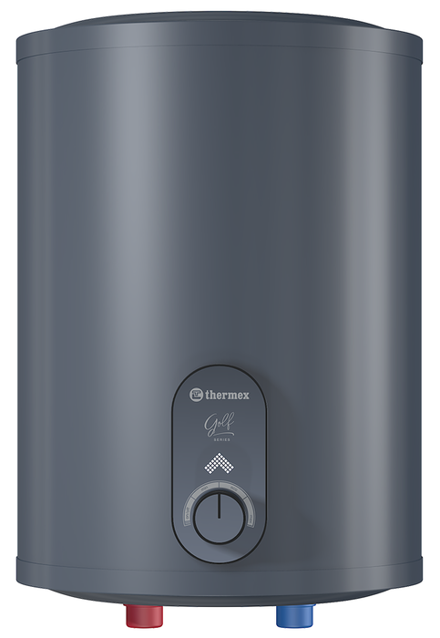 THERMEX (Термекс) Golf 10 O представляет собой аккумуляционный электрический бойлер малого объема. Внутренний бак в нем изготовлен из нержавеющей стали, а для нагрева воды используется трубчатый электрический нагреватель TitaniumHeat. На передней панели находится механический регулятор температуры с индикацией нагрева.