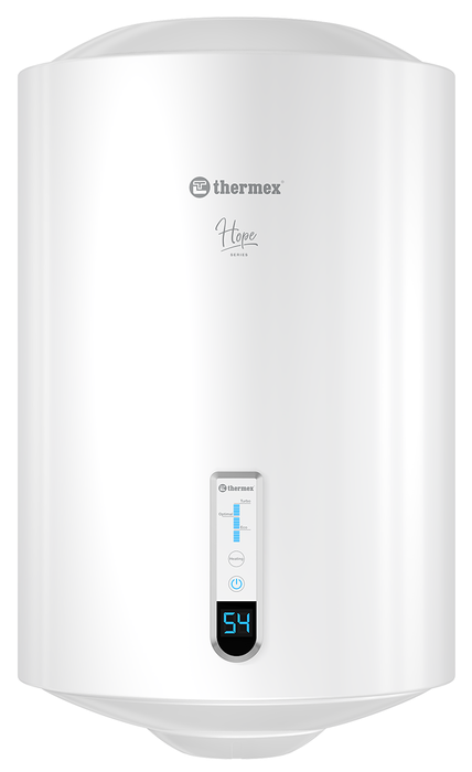 THERMEX (Термекс) Hope 80 V это электрический водонагреватель накопительного типа, выполненный в компактном круглом корпусе белого цвета. Он оснащен трубчатым нагревательным элементом, магниевым анодом и внутренним баком из биостеклофарфора. Спереди на корпусе находится электронная панель управления и небольшой дисплей.