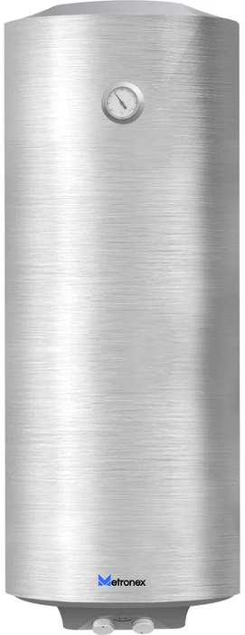 Metronex (Метронекс) TitanHeat MX WH 1.5kW 50 л Silver Slim представляет собой электрический водонагреватель с мощностью ТЭНа 1.5 кВт и объемом внутреннего бака 50 литров. Корпус имеет вытянутую форму, в нижней части корпуса находятся механические регуляторы, а сверху термометр. Трубы водопроводной сети подведены снизу.