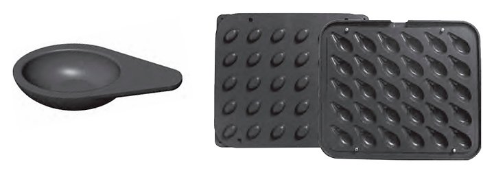 ФормаPAVONICOOKMATIC R используется совместно с тарталетницами NEWCOOKMATIC иNEWCOOKMATIC SPECIALв пекарнях и кондитерских, на предприятиях пищевой промышленности и общественного питания. Модель состоит из 2 пластин и позволяет выпекать тарталетки вформе ложки. Пластины выполнены из алюминия, контактирующие с продуктами элементы имеют антипригарное покрытие.