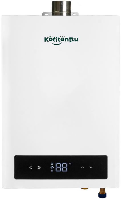 Проточный водонагреватель Kotitonttu (Котитонту) SUARI S13 ST работает на газу и оснащен системой модуляции. Удаление отработанных газов происходит за счет встроенной турбины (воздух для смеси забирается из помещения). Такая схема может использоваться только в частных домах, в которых отсутствует централизованный дымвентканал. Поставляется с дымоотводящей трубой.