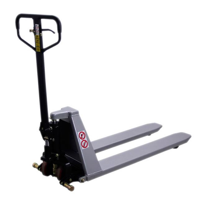 Рохля оборудована удобной прорезиненной рукояткой, поворотными полиуретановыми колесами и направляющими роликами. Есть система защиты от перегрузки и функция контроля скорости снижения вил. Представленная модель отличается высокой эргономичностью и отличной мобильностью.