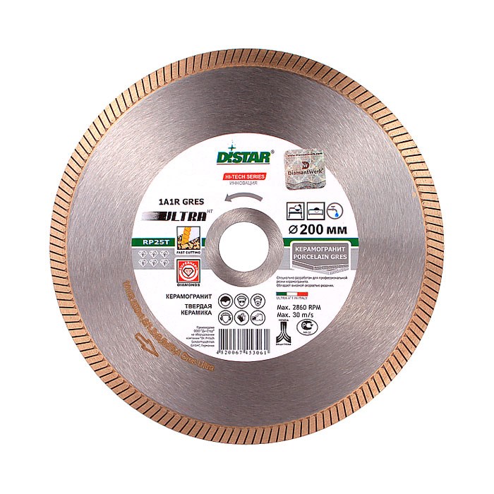 Диаметр данного диска составляет 230 мм. Он хорошо подходит для резки настенной и напольной керамической плитки, всех видов гранита и мрамора, а также керамогранита. Способен работать на высокой скорости и демонстрирует хорошую производительность. При резке предусматривает применение охлаждающей жидкости. Используется на станках. Толщина диска 1,6 мм.
