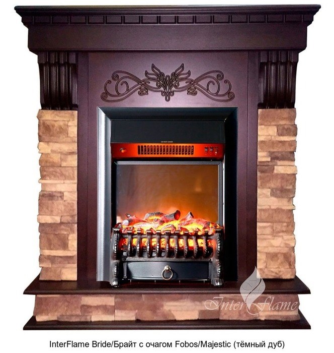 Электрический камин InterFlame (ИнтерФлейм) Bride/Брайт с очагом Fobos/Majestic это очень элегантный камин в классическом стиле, который, безусловно, станет ключевой деталью интерьера Вашего дома. Устройство изготовлено из качественного МДФ класса Е-1. Облицовка выполнена из специально обработанного камня и дополнена шпоном дуба. Сделано в России.
