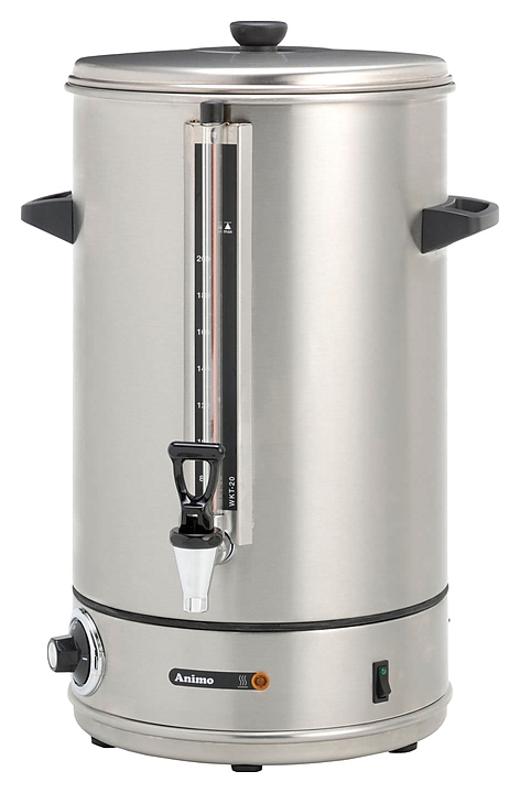 Кипятильник Animo WKT 20N VA предназначен для быстрого подогрева воды на предприятиях общественного питания. Прибор оснащен термостатом для регулирования температуры, защитой от включения нагрева при отсутствии воды и неподтекающим краном. Корпус выполнен из нержавеющей стали 18 / 9, индикатор уровня воды - из стекла, ручки - синтетические.