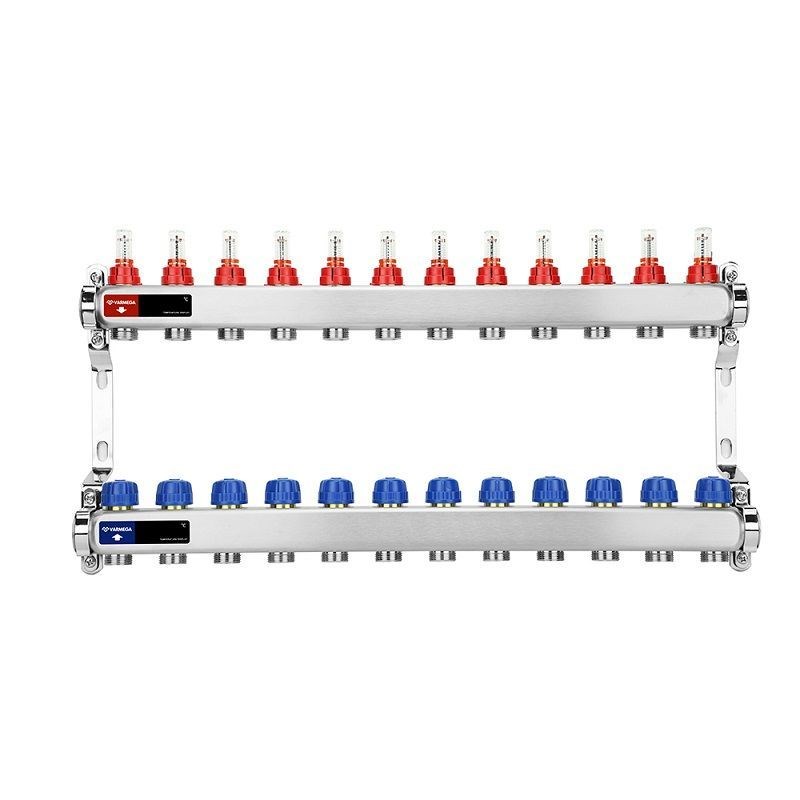 Коллекторные группы предварительной сборки из нержавеющей стали с расходомерами марки Varmega предназначены для распределения и регулирования потоков теплоносителя в низкотемпературных системах отопления напольное отопление. Оснащены расходомерами на подающем коллекторе и термостатическими вентилями с размером M30x1,5 с возможностью установки термоэлектрических приводов на обратном коллекторе.
