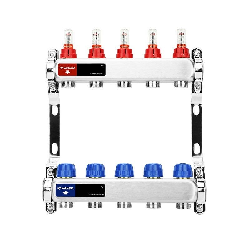 Коллекторные группы предварительной сборки из нержавеющей стали с расходомерами марки Varmega предназначены для распределения и регулирования потоков теплоносителя в низкотемпературных системах отопления напольное отопление. Оснащены расходомерами на подающем коллекторе и термостатическими вентилями с размером M30x1,5 с возможностью установки термоэлектрических приводов на обратном коллекторе.