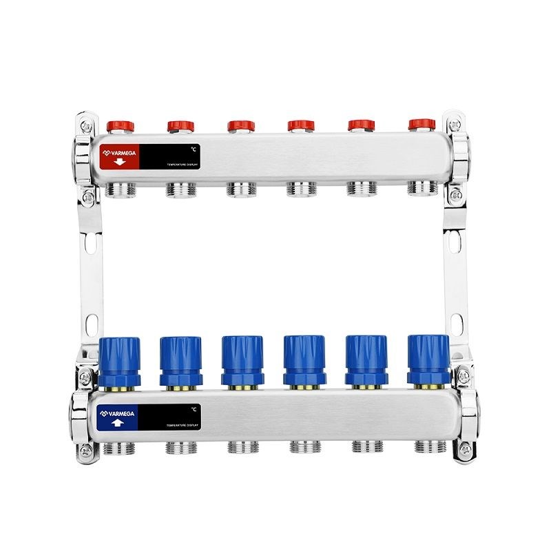 Коллекторные группы предварительной сборки из нержавеющей стали с балансировочными и термостатическими вентилями марки Varmega предназначены для распределения и регулирования потоков теплоносителя в низко- и высокотемпературных системах отопления. Оснащены балансировочными вентилями на подающем коллекторе и термостатическими вентилями с размером M30x1,5 с возможностью установки термоэлектрических приводов на обратном коллекторе.