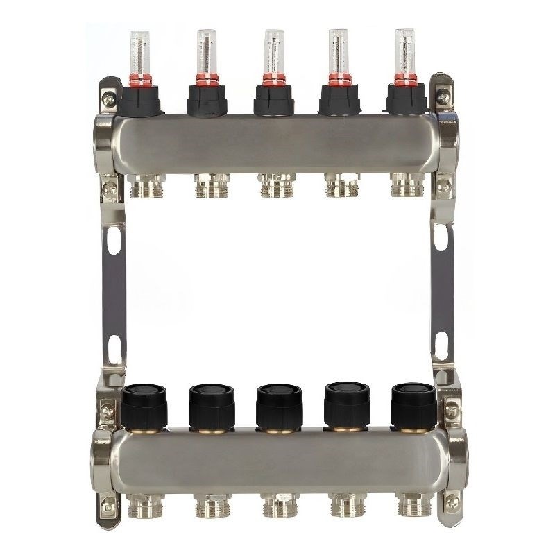 Коллекторный блок из нержавеющей стали служит для распределения потоков по контурам теплого пола, радиаторного отопления, прочих климатических систем, где в качестве теплоносителя используется вода либо незамерзающие растворы гликоля с максимальной рабочей температурой 90 °С, рабочим давлением до 9 бар.
