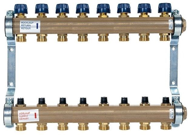 Выходы: 3/4 НР с евроконусом, расстояние между отводами 50 мм. Минимальная величина заглубления при скрытом монтаже. Концевые группы с воздушным клапаном в комплекте.