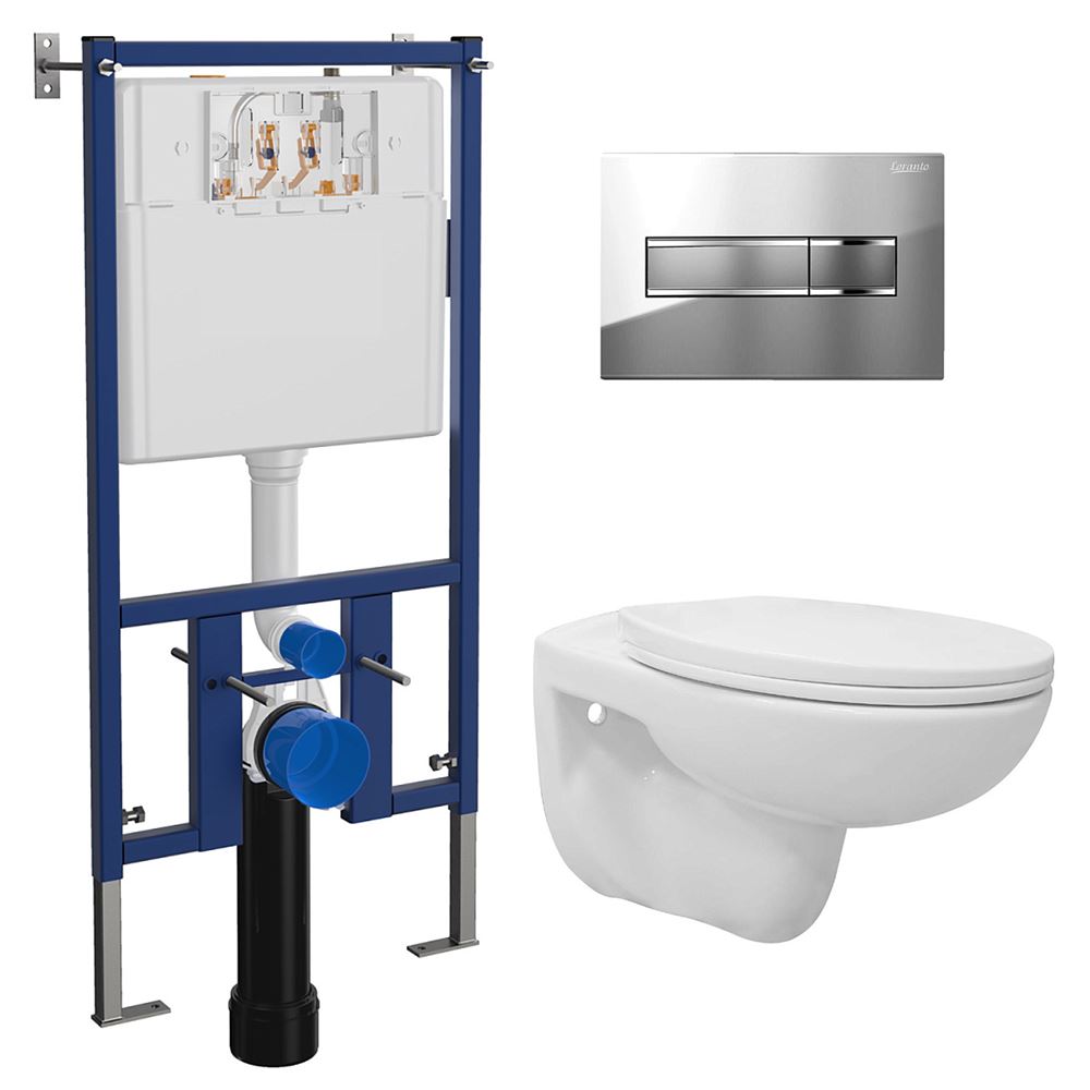 Комплект унитаз с инсталляцией Loranto с кнопкой Line хром глянец + Fredo безободковый с сиденьем микролифт (soft close) дюропласт, 4501+7322+CS-WH8005