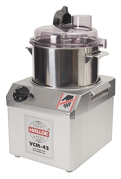 Куттер Hallde VCM-42 предназначен для переработки влагосодержащих, сухих и жидких пищевых продуктов: измельчение, мелкая нарезка и перемешивание практического любого типа продукта - от овощей до орехов, приготовление ароматизированных масел, майонеза, десертов, фарша, пюре, паштетов, панировочных сухарей и т.п.