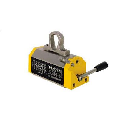 Магнитный грузозахват MaxX 250 отлично справляется с транспортировкой металлических плит, труб, балок, листов, цилиндров. Он имеет прочный стальной корпус, а также два ряда магнитов, которые обеспечивают захват детали. Для магнитизации и размагнетизации используется специальный стальной рычаг с резиновой рукояткой. Элементы конструкции содержат никель и надежно защищены от коррозии. При превышении веса детали рукоятка будет препятствовать включению. Данная модель гарантирует захват только одной детали.