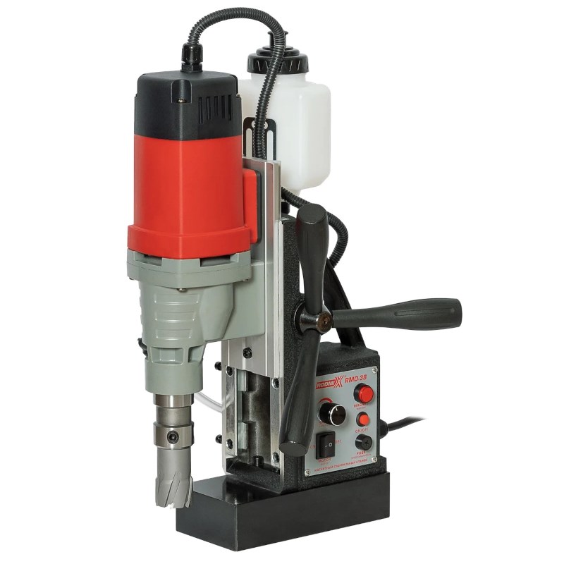 Наименьшая переносная модель из линейки RMD-38 магнитный станок используется для сверления отверстий в металле диаметром до 38 мм. Работает с корончатыми сверлами размером до 38 мм в диаметре и спиральными - до 13 мм. Прижимная сила магнита - 14500 N (1478,58 кг). Минимальная толщина металла для прижима составляет 6 мм.