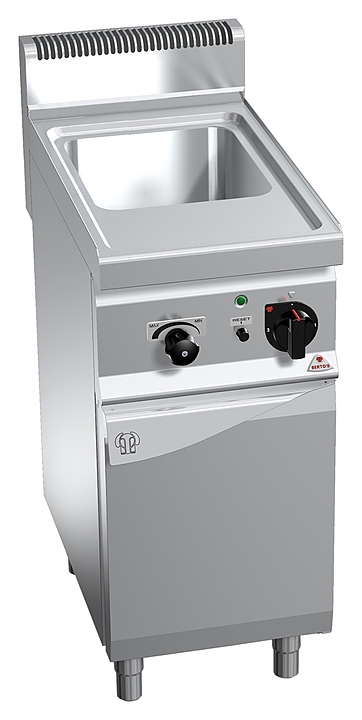 Макароноварка Bertos CPE40 серии macros 700 предназначена для приготовления пасты, риса, овощей, пельменей, вареников, яиц, морепродуктов и других продуктов на предприятиях общественного питания и торговли. Модель оснащена высокопрочными ТЭНами, расположенными непосредственно на дне емкости и защищенными перфорированным дном.