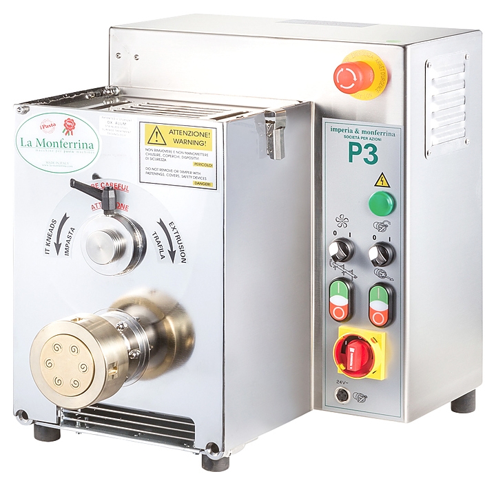 Машина для производства макаронных изделий La Monferrina P3 используется на предприятиях общественного питания. Модель оснащена вентилятором для принудительного охлаждения двигателя и редуктора. Корпус выполнен из анодированного алюминия, компоненты, контактирующие с тестом - из нержавеющей стали, фильера- из бронзы.