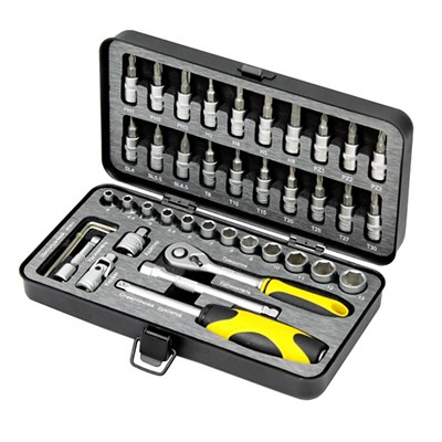 Комплектация: поставляется с 12 торцевыми головками размером от 4 до 13 мм, удлинителями, трещоткой, переходниками, шарниром, шестигранными ключами, адаптером и битами. В комплекте ударопрочный кейс из металла для удобства хранения и переноски. Предусмотрено защитное покрытие стальных инструментов для предотвращения коррозии.