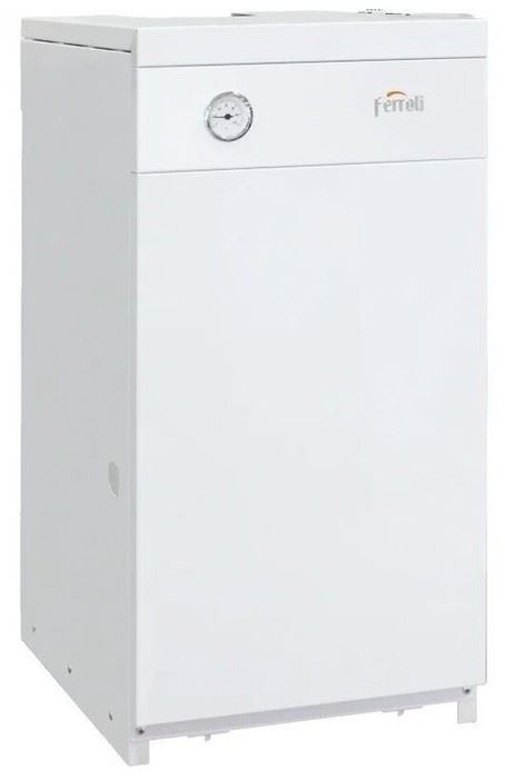 Ferroli (Ферроли) TORINO 100 этот газовый напольный котёл, не зависит от внешних источников и имеет возможность подвода газа с двух сторон, удобную для чистки конструкцию дымосборника и всего корпуса в целом, защищён от перегрева, а при необходимости есть возможность перевода на работу на сжиженном газе.