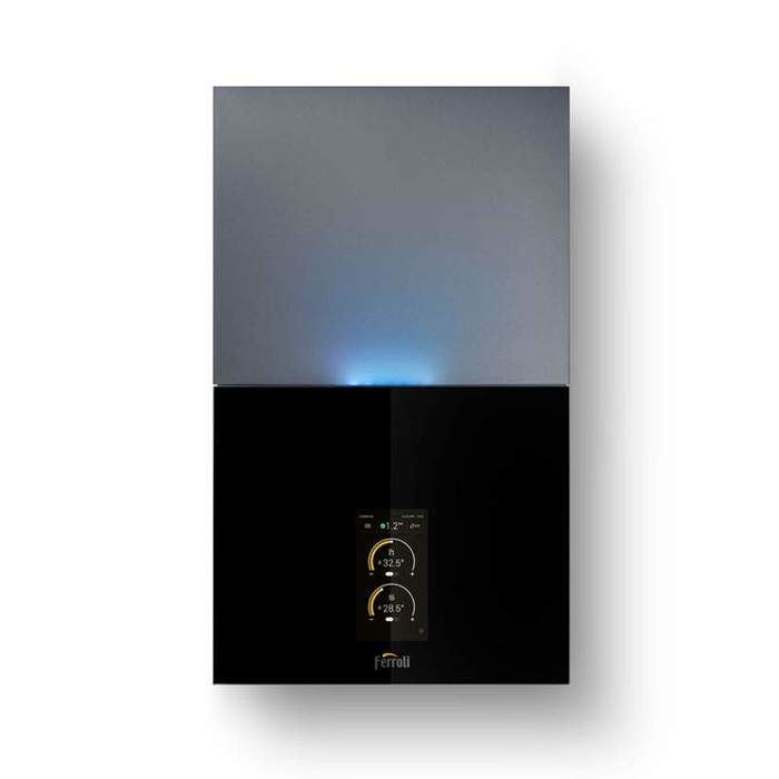 Современный стильный настенный двухконтурный газовый котел от Ferroli (Ферроли) BLUEHELIX MAXIMA 28C, очень стильное лаконичное решения для любого современного интерьера квартиры или дома. Передняя панель котла выполнена из стильного черного закаленного небьющегося стекла с мягкой подсветкой.