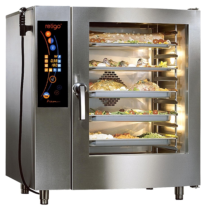 Пароконвектомат Retigo O1011ICVISION IIсерии Orange VisionII предназначен для обжаривания, приготовления на пару, бланширования, запекания и других видов тепловой обработки продуктов на фабриках-кухнях, предприятиях общественного питания и торговли. Оборудование заменяет сразу несколько видов приборов: плиту, конвекционную печь, жарочный шкаф, духовку, опрокидывающуюся сковороду, пищеварочный котел и фритюрницу. Приготовленные в пароконвектомате блюда сохраняют все полезные вещества. Модель оснащена сенсорной панелью управления.