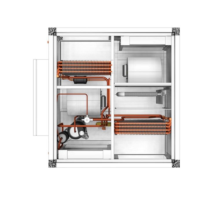 - Встроенный реверсивный тепловой насос, заправленный озонобезопасным фреоном R410А, состоит из компрессора и двух теплообменников (испаритель и конденсатор), охлаждает или нагревает приточный воздух для создания и поддержания в помещении комфортного микроклимата