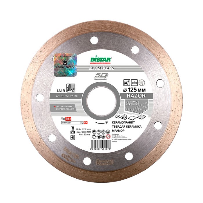 Диск отрезной алмазный относится к серии Razor и предполагает диаметр 150 мм. Он используется в качестве оснастки для болгарок не требует охлаждения. Применяется для реза мрамора мягких и средних пород, гранита, очень твердого керамогранита, настенной и напольной плитки. Имеет хорошую скорость и высокий ресурс. Отличается высокой производительностью. Толщина диска 1,6 мм.