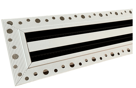 Щелевая решетка вентиляционная (щелевой диффузор) РЭД-TSD-ЛУК модифицированная, отличается наличием стальной перфорации на задней части решетки и возможностью скрытого монтажа под шпаклевку. Перфорация покрыта порошковой краской в черный матовый цвет. Интересный дизайн и возможность применения как декоративного перекрытия в системе вентиляции и кондиционирования, как вытяжной диффузор. Усиленный профиль и уникальная технология производства, позволяет добиться высокой точности в линиях при стыковке нескольких диффузоров в одну непрерывную линию. Возможно исполнение с шириной щели 15 и 20 мм. Модель с возможностью регулировки направления и объема поступающего воздуха с фланцем РЭД-TSD