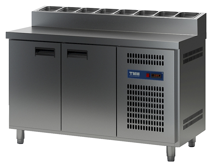 Стол для пиццыТММ СХСК-П-1/2Диспользуется на предприятиях общественного питания и торговлидля раскатки теста и обработки ингредиентов для приготовления пиццы, охлаждения и кратковременного хранения скоропортящихся продуктов и напитков. Надстройка обеспечивает легкий доступ к используемым компонентам. Цельнозаливной корпус и фасад выполнены из нержавеющей стали AISI 340, задняя стенка - из оцинкованной стали.