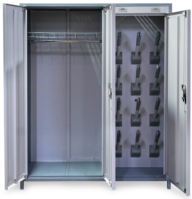 - Шкаф имеет два отделения: для сушки одежды с двумя дверьми, закрывающимися ригельным замком и для сушки обуви с одной дверью, также закрывающейся ригельным замком.