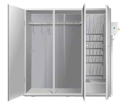- Оборудована антивандальными вешалками для спецодежды и подставками для обуви, полкой для головных уборов и рукавиц, гофра-трубой 10м. для подключения к вентиляции.