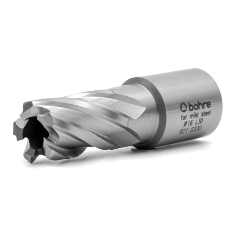 Bohre 16 мм — кольцевая корончатая фреза длиной 30 мм. Для производства применяется быстрорежущая сталь HSS, которую можно затачивать до 10 раз. Скорость проходки составляет до сантиметра в минуту. Посадка Weldon подходит для большинства магнитных сверлильных машин. Для продления срока службы рекомендуем работать с СОЖ.