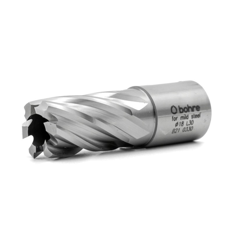 Bohre 18 мм — кольцевая корончатая фреза длиной 30 мм. Для производства используется HSS-сталь (быстрорежущая), которую можно затачивать до 10 раз. Производительность работы составляет до 10 мм/мин. Посадка Weldon подходит для большинства магнитно-сверлильных станков. Для продления срока службы советуем работать со смазочно-охлаждающей жидкостью.