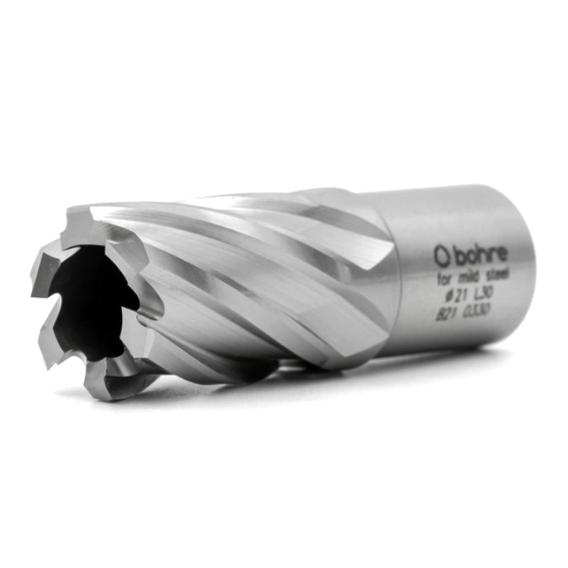 Bohre 21 мм — кольцевая фреза длиной 30 мм. Для производства применяется быстрорежущая сталь HSS, поддающаяся многократной заточке. Производительность проходки составляет до 10 мм/мин. Посадочное отверстие Weldon подходит для большинства магнитных сверлильных машин. Для продления срока службы рекомендуется работать со смазочно-охлаждающей жидкостью.