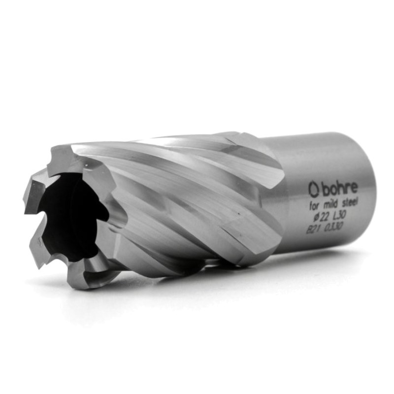 Bohre 22 мм — кольцевая корончатая фреза длиной 30 мм. Для производства используется быстрорежущая сталь HSS, поддающаяся многократной заточке. Производительность работы составляет до 10 мм/мин. Посадочное отверстие Weldon подходит для большинства магнитных сверлильных машин. Для продления срока службы советуем работать с СОЖ.